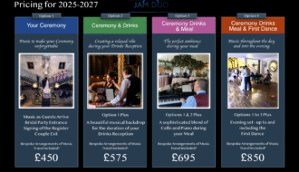 Live music by JAM Duo – Piano and Cello for Ceremony & Drinks Reception