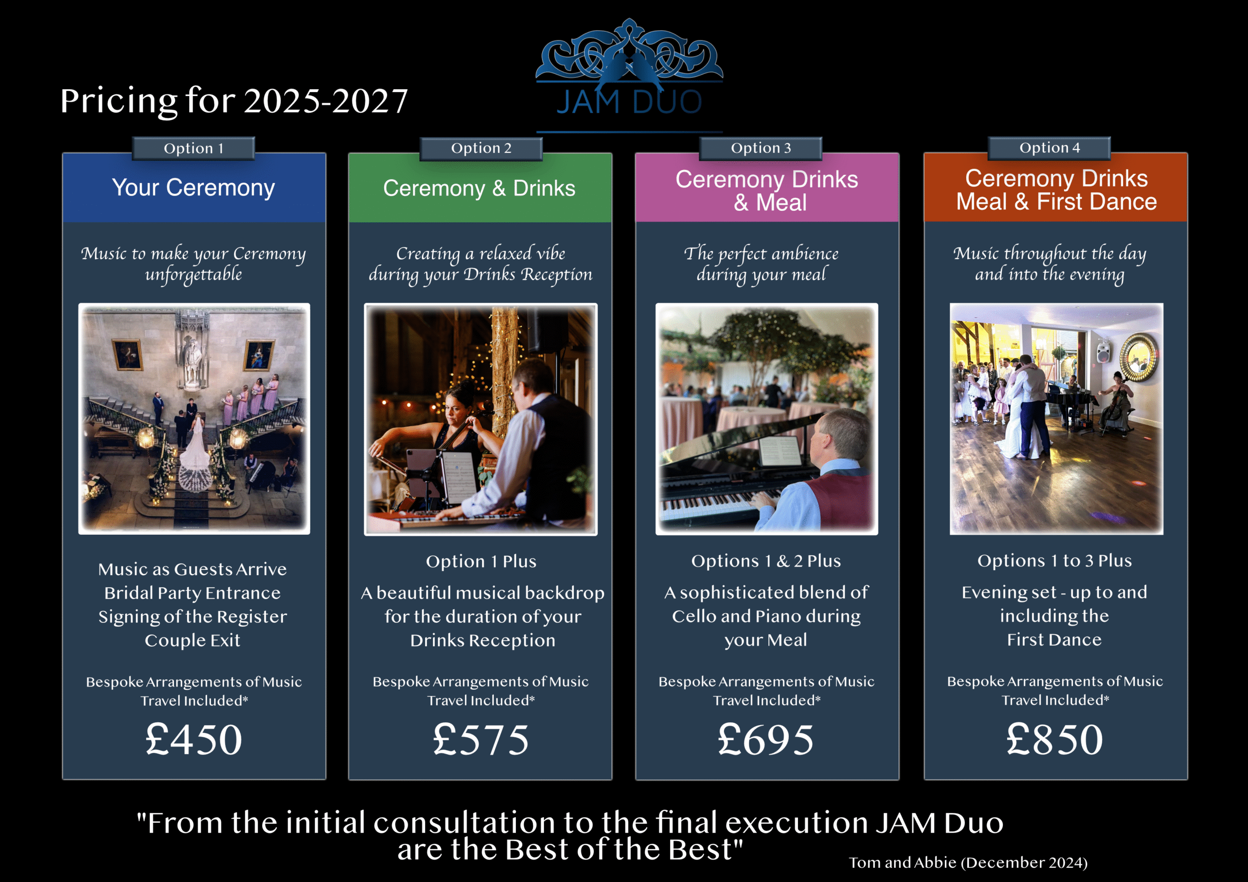 With JAM Duo, you can expect a seamless blend of professionalism, talent, and versatility. Our goal is to surpass your expectations and bring your wedding vision to life through the power of music. We are committed to providing the highest quality performance, ensuring that every note played is imbued with passion and artistry.